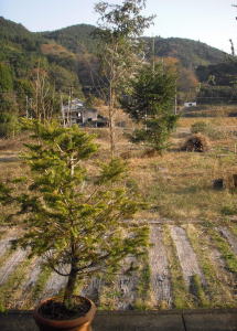 手前が2代目モミの木。庭にあるのが初代。