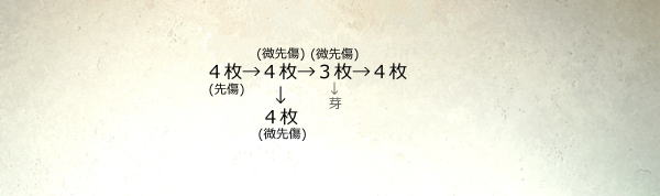 よく引き合いに出される〈月の誉〉とは決定的な違いはあっても、似た部分が多く系統的にかなり近いものと推測されます。特に葉質、葉姿で見分けることは困難で、実際、この商品も〈月の誉〉として仕入れたものです。前の所有者さんが入手する前から、間違いが引き継がれてきたのだと思います。「〈月の誉〉を咲かせてみたら〈彩風〉だった」とか、逆のケースも含め、相当多いのではないでしょうか。