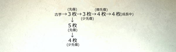 今回ご紹介したのは、今年4月に入手した、開花が見込まれる〈払越の赤〉6種のうちの1株です。 葉状からすると払越系統の平均的な株(スタンダードなタイプ)と思われます。 現時点で〈払越の赤花〉というのは担保されますが、花の最終確認ができていないので、中身の分からない福袋みたいなものかもしれません。