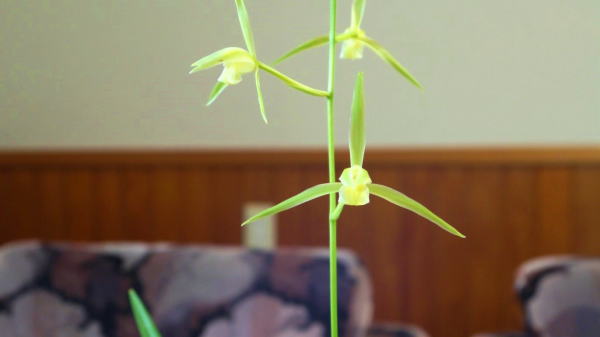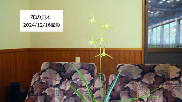 今回ご紹介した〈豊雪〉は葉肉が薄く、垂れ葉になりがちで、花は平均より小振りに咲くことが多く、白黄色にきまりやすい。私が勝手に〈薄葉豊雪〉と呼んでいる希少性の高い株です。葉色も薄く萌黄葉のような印象を受けるのではないでしょうか。三角咲中輪の素心系金鵄で、舌の奥や前面に色が出る性質を孕んでいるといったところは〈豊雪〉と一致します。
