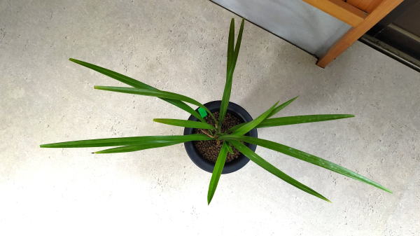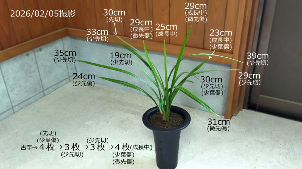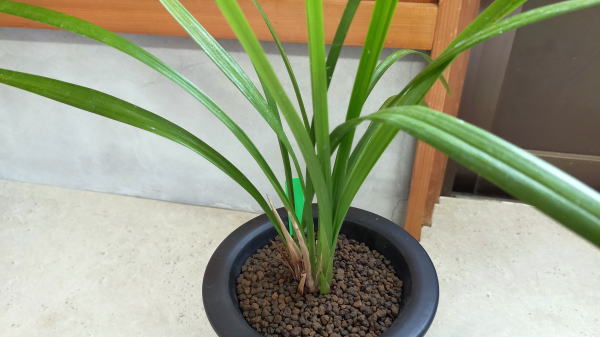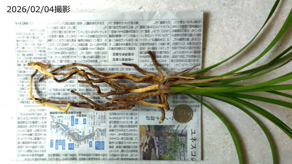 今回ご紹介した〈豊雪〉は葉肉が薄く、垂れ葉になりがちで、花は平均より小振りに咲くことが多く、白黄色にきまりやすい。私が勝手に〈薄葉豊雪〉と呼んでいる希少性の高い株です。葉色も薄く萌黄葉のような印象を受けるのではないでしょうか。三角咲中輪の素心系金鵄で、舌の奥や前面に色が出る性質を孕んでいるといったところは〈豊雪〉と一致します。