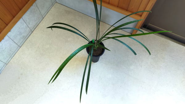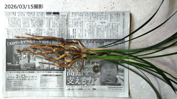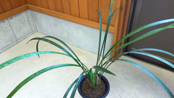 高知県土佐清水市下ノ加江の産。長めの垂れ葉を高く抜いて咲く花間のよい紫紅色の大輪〜極大輪、一文字にちかい三角咲です。品評会に有利な条件のほとんどを備えています。