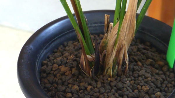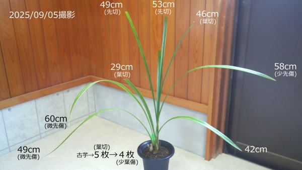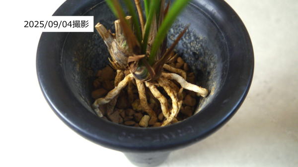 花芽が付いている2条立の成木株を載せました。親木の葉先を切除しているのは残念に思いますが、根の状態が良いので今後の株の充実に期待しましょう。