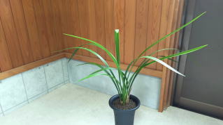 | 寒蘭柄物全国連合会 平成2年度登録(86号) 硬質で短めの中立葉、葉先の鋭い先斑縞です。小葉の性質を持っています。 平肩咲き中大輪の緑黄〜白黄花、ほとんど色線の入らないキレのある花弁が魅力的。 2条立相当の苗を載せました。8月に出品した苗と似た感じです。 |